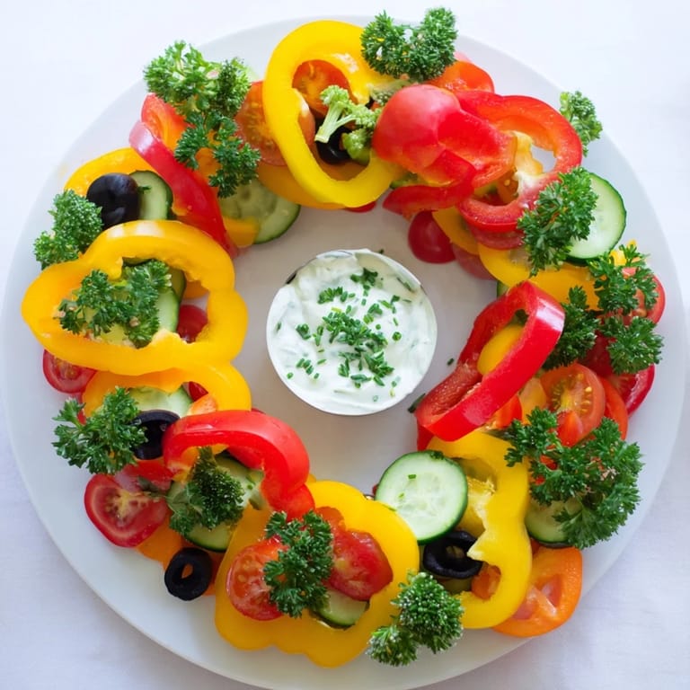 - On a large round platter, create a circular wreath shape by alternating bell pepper rings, broccoli florets, cherry tomatoes, and cucumber slices. Add olives for color and scatter fresh parsley or rosemary sprigs around for a festive look.