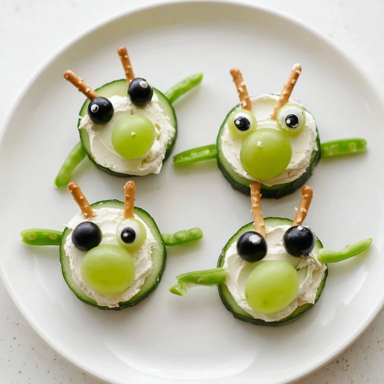 - Insert two pretzel sticks into the top of each cucumber, securing them with a dab of cream cheese if needed. Place a grape or olive piece at the tip of each pretzel to create antennae.