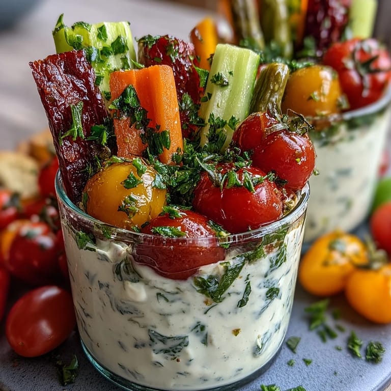 Pin When the summer sun is shining and you need a refreshing, nutritious snack that's as beautiful as it is delicious, these veggie cups with Greek yogurt ranch dip are your answer. Bursting with vibrant colors from fresh cherry tomatoes, crisp cucumbers, sweet bell peppers, crunchy carrots, and celery sticks, each cup is a celebration of garden-fresh goodness. The creamy, tangy ranch dip made with protein-rich Greek yogurt transforms simple vegetables into an irresistible treat that's perfect for poolside gatherings, picnics, or healthy afternoon snacking.