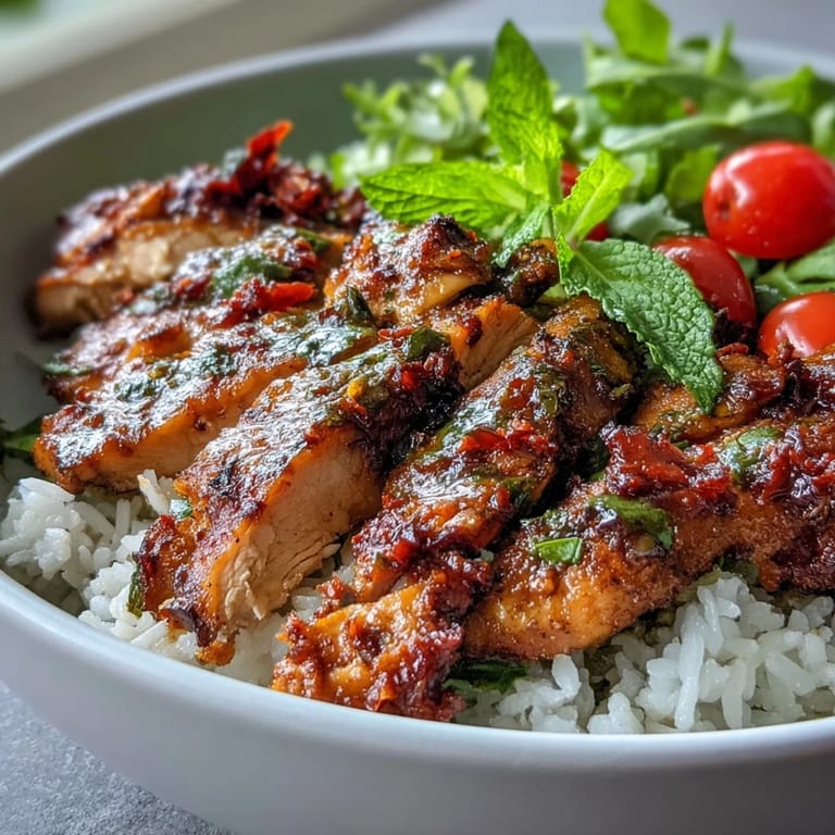 - Spoon a generous mound of fluffy rice into each bowl, arrange the sliced chicken on top, and tuck in handfuls of fresh greens and halved cherry tomatoes. Finish with crumbled feta and toasted pine nuts if you're using them, and drizzle everything with a little extra sun-dried tomato oil or a squeeze of lemon.