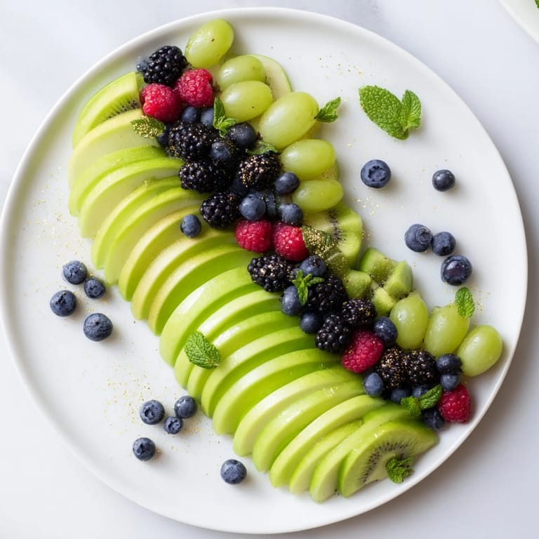 - Arrange the green grapes, kiwi slices, and apple slices in gentle, wavy lines across your platter, like you're drawing undulating ribbons with your hands. Step back and squint—you should see a soft S-curve or wave pattern, not a straight line.