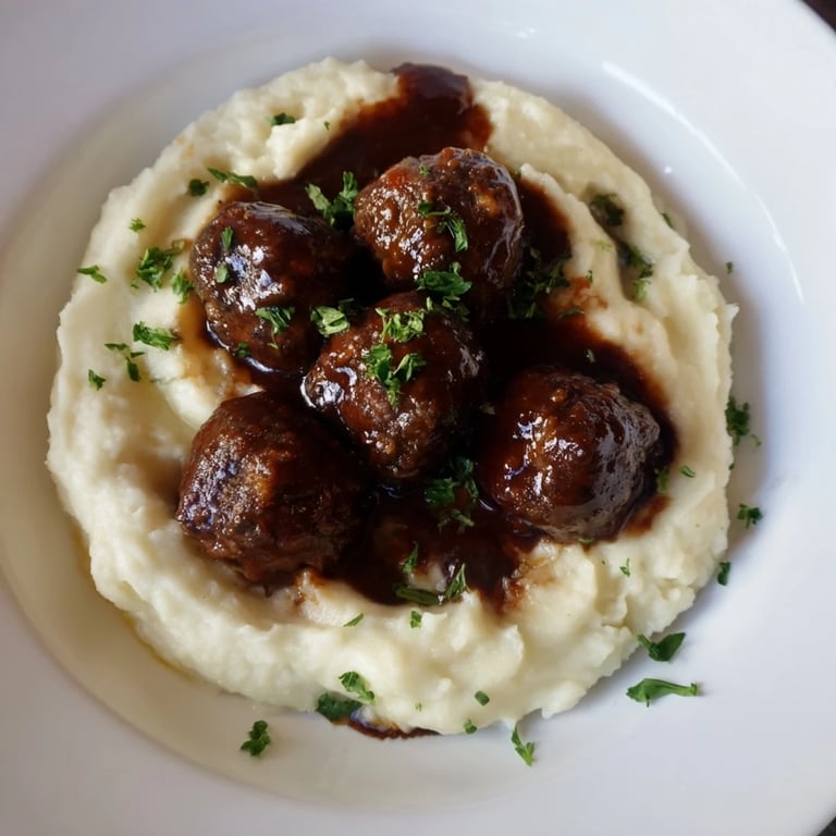 - Spoon mashed potatoes onto plates, top with BBQ meatballs, and drizzle with extra sauce. Garnish with chives or parsley if desired.