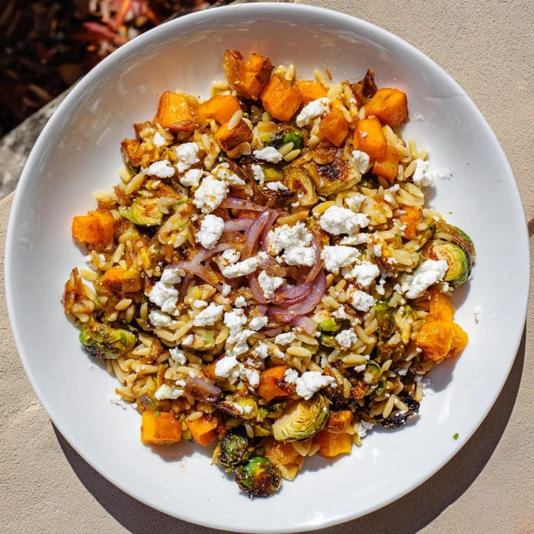 Pin A vibrant, autumn-inspired salad featuring roasted butternut squash, brussels sprouts, creamy goat cheese, and a sweet-tangy maple balsamic vinaigrette. Perfect as a side or light main dish.