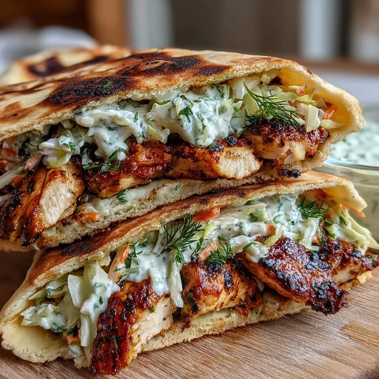 - Cut your warm pitas in half to create pockets or leave them whole and layer the fillings—chicken first, then a generous handful of ranch slaw, then any optional toppings like cucumber slices or cherry tomatoes. Garnish with extra fresh herbs and serve immediately while everything is still warm and fresh.