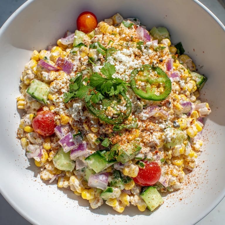 Pin A vibrant, zesty salad inspired by classic Mexican street corn (elote), featuring sweet corn, creamy dressing, fresh vegetables, and a hint of spice—perfect for picnics, barbecues, or a refreshing side dish.