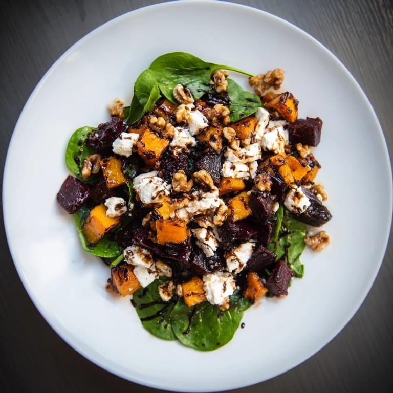 Pin A vibrant, hearty salad featuring sweet roasted beets and butternut squash, fresh baby spinach, creamy goat cheese, and crunchy walnuts, all tossed in a tangy balsamic vinaigrette. This recipe offers a modern European touch while remaining vegetarian and gluten-free.