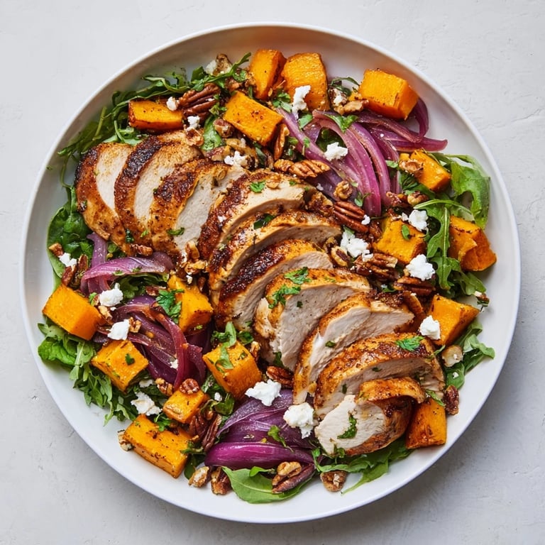 Pin A hearty, vibrant salad featuring juicy roasted chicken, caramelized winter squash, and crisp greens baked together on one sheet pan for easy preparation and cleanup. Perfect for a cozy, flavorful meal that brings comfort to your table.
