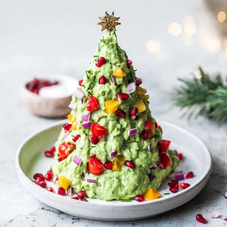 Pin A festive, creamy avocado dip artfully shaped into a Christmas tree, decorated with colorful vegetables and fresh herbs. Perfect as a holiday appetizer or centerpiece.